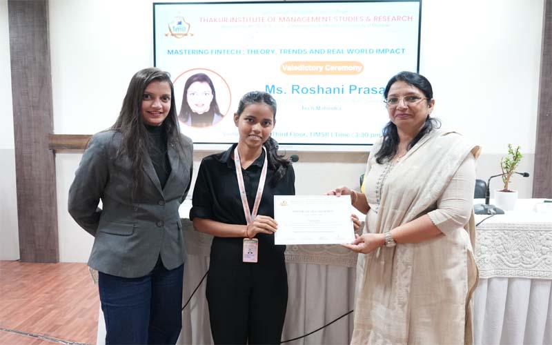 TIMSR’s Fintech Cell organized a valedictory session for the 30-hour Certification Course on “Mastering FinTech: Theory, Trends and Real–World Impact” for the students of MMS, Sem-III (Batch 2024–26) on 11th September 2025. Designed across four comprehensive modules, the course introduced students to the evolution of FinTech and financial digital transformation, innovations in payments and digital currencies, the role of AI, big data and risk management, and entrepreneurial as well as career opportunities in the FinTech sector.